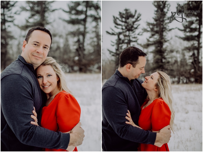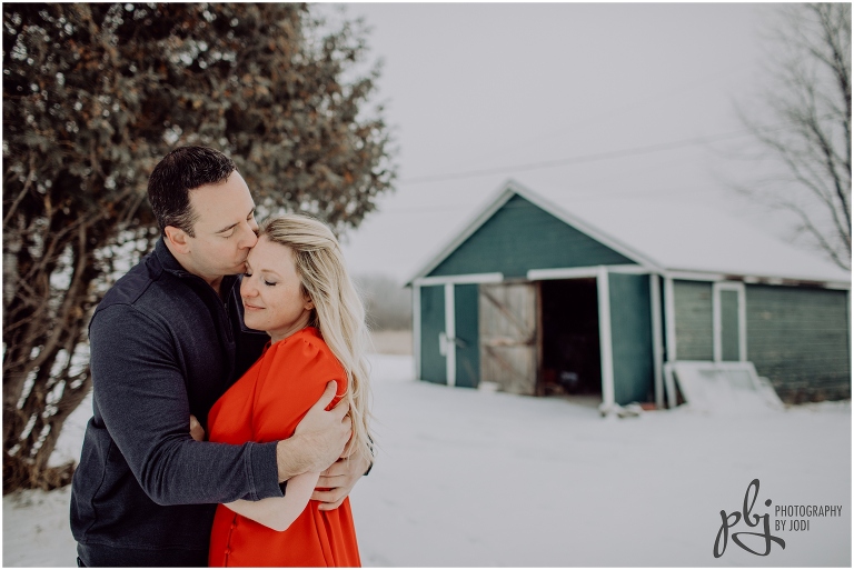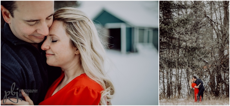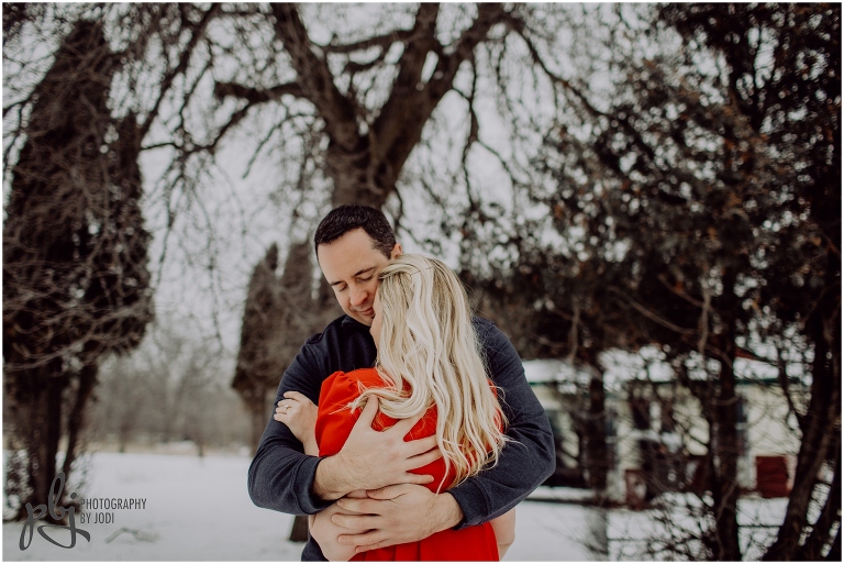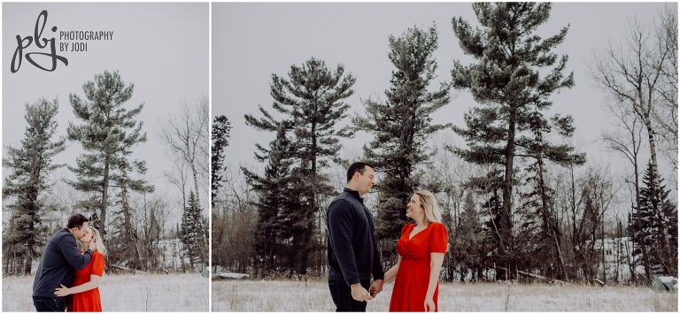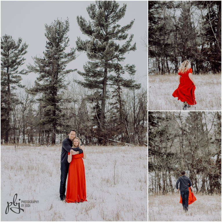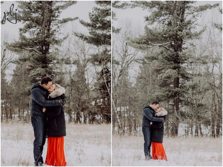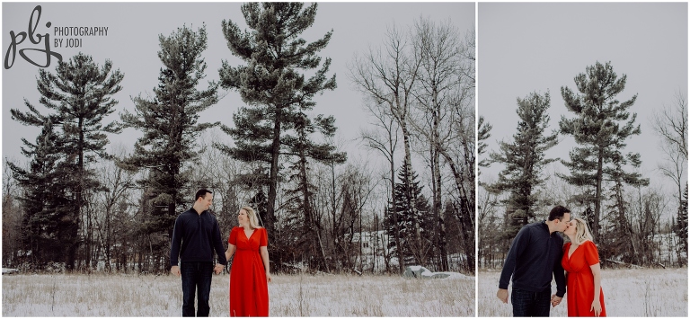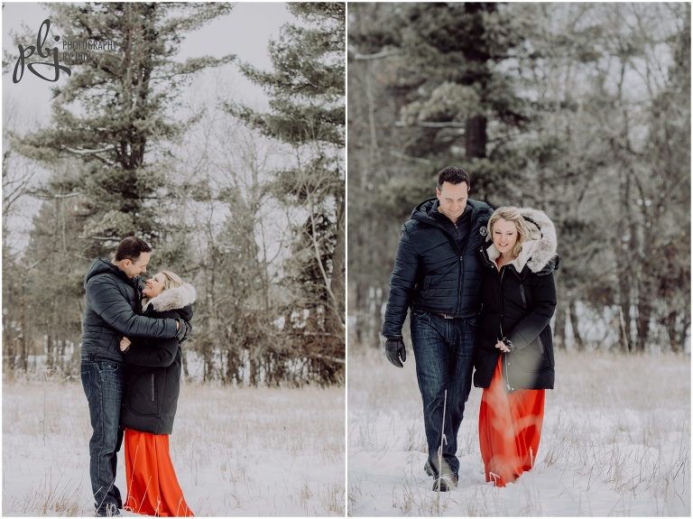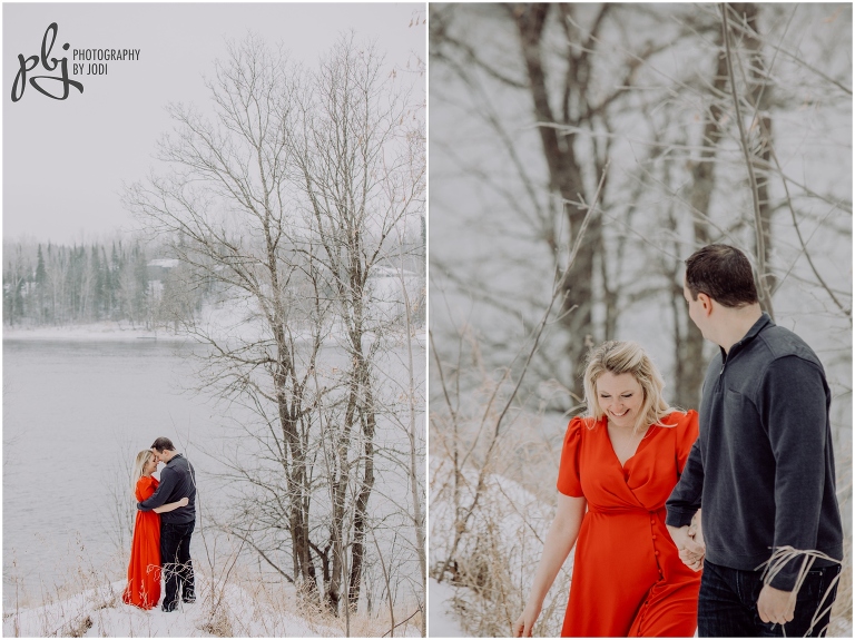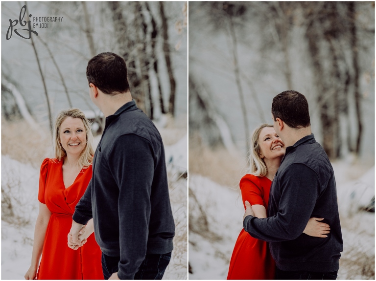 When Melissa sent me her idea of what she would like to wear for their session I was super pumped! I love when people are bold with their colours and outfits. She was definitely brave with her short sleeve dress. Wow. Amazing. Plus she lasted a long time too. She had hand warmers she carried around and warm packs she put in her boots. Smart lady! Your next session will be much warmer and tropical. I hope you have a wonderful wedding together this winter. I really enjoyed wandering around with you two and getting to know you a bit. Thanks for making the drive out here and for contacting me to capture this session for you.